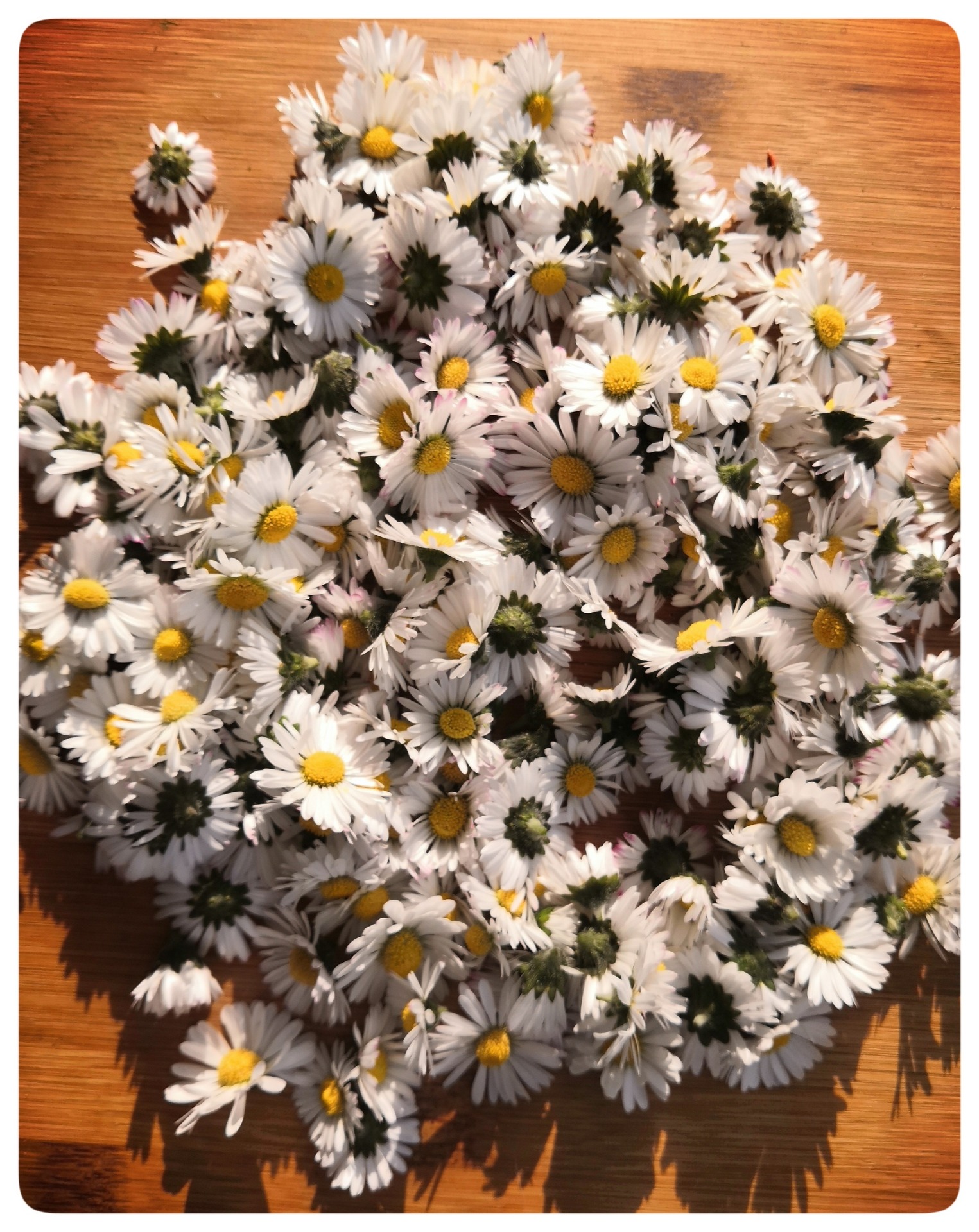- Récupérer seulement la fleurs sans la tige de vos pâquerettes et rincez les à l'eau pour les rincer (laisser les sécher 24h pour qu'elles perdent leur humidité);